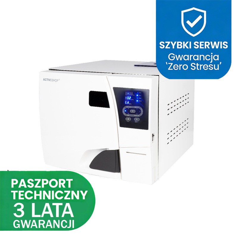 To kompaktowe urządzenie o pojemności 18 litrów posiada wbudowaną drukarkę termiczną, która nie wymaga stosowania tuszu. Czytelny wyświetlacz LED informuje o parametrach takich jak czas, temperatura i ciśnienie. System autodiagnozy oraz podwójna blokada drzwi dbają o bezpieczeństwo użytkownika i trwałość sprzętu.