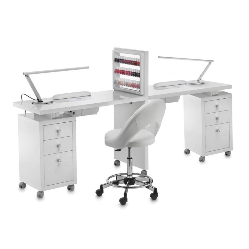 Podwójny stolik do manicure Square Double Display jest idealny do stworzenia profesjonalnej strefy do manicure w salonie. Stół ma 2 stanowiska robocze oddzielone centralnym wyświetlaczem, z którego obaj operatorzy mogą wybrać lakier do paznokci. Ekspozytor ma 3 półki z pleksiglasu otwierane po obu stronach i może pomieścić do 40 butelek z lakierem do paznokci. Blaty stołu z lakierowanego drewna są duże i pozwalają na swobodną pracę, wszystkie niezbędne urządzenia do usług manicure znajdują swoje miejsce na stole bez zakłócania pracy operatora. Lakierowanie blatu ma specjalną ochronę, która pozwala na jego czyszczenie acetonem bez ryzyka uszkodzenia powierzchni. Dołączony pochłaniacz z filtrem z węglem aktywnym ma moc 60 Watt wyprodukowany we Włoszech, który zasysa kurz i redukuje zapachy. Stół jest również wyposażony w poduszkę dla klienta i lampkę z neonem. Szafki wykonane z lakierowanego drewna mają 2 szuflady i przesuwany pojemnik i są praktyczne do umieszczenia wszystkich potrzebnych butelek i narzędzi. Koła ułatwiają ruch, ale można je zablokować za pomocą hamulca. Położenie półeczek na lakiery nie jest ustalone, na życzenie istnieje możliwość stworzenia innego rozwiązania poprzez zmianę jego położenia oraz ustawienie szafek zgodnie z własnymi potrzebami.