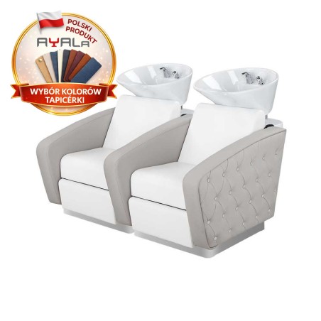 Do myjni fryzjerskich Ayala dostępne są różne akcesoria, takie jak podnóżki, uchwyty na suszarki, podkładki pod kark, które zwiększają komfort korzystania z urządzenia podczas usług fryzjerskich.