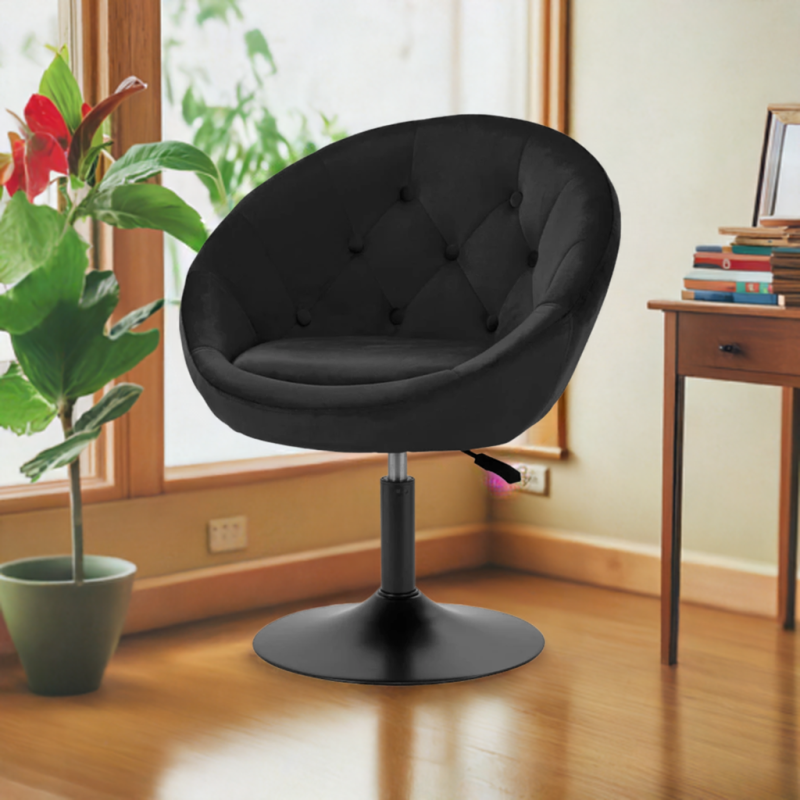 Luksusowe wykończenie sprawia, że mebel wpada w oko. Przyjemne w dotyku, welwetowe obicie w odcieniach czerni wraz z ozdobnym pikowaniem nadają mu wyjątkowego charakteru. Stabilna, okrągła podstawa w odcieniach czerni dodaje elegancji, idealnie komponując się z welwetem. Estetyka wykonania, komfort użytkowania, ergonomicznie wyprofilowane oparcie i estetyczne pikowanie sprawiają, że krzesło spełni wymagania nawet najbardziej wymagających użytkowników.