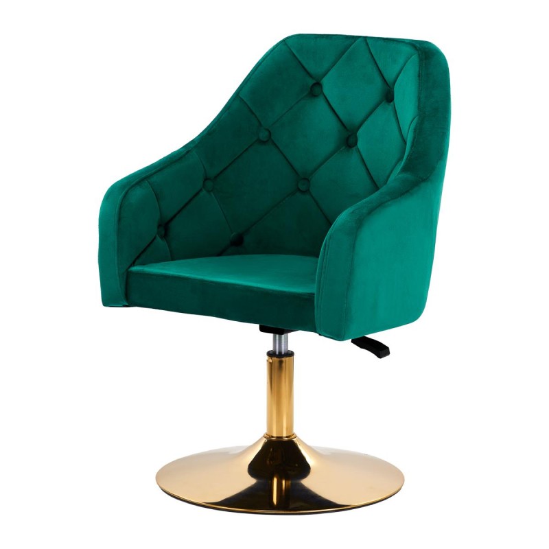 Ciekawy design nadaje krzesłu wyjątkowego charakteru. Przyjemne w dotyku, welwetowe obicie w odcieniach zieleni wraz z ozdobnym pikowaniem sprawiają, że będzie ozdobą każdego wnętrza. Stabilna, okrągła podstawa w odcieniach złota dodaje elegancji, idealnie komponując się z welwetem. Estetyka wykonania, komfortowo osadzone podłokietniki, ergonomicznie wyprofilowane oparcie i estetyczne pikowanie sprawiają, że krzesło spełni wymagania nawet najbardziej wymagających użytkowników.
