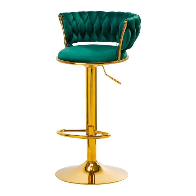 Przyjemne w dotyku, welwetowe obicie w odcieniach zieleni nadaje hokerowi wyjątkowego charakteru, a estetycznie przeplatany materiał na oparciu podkreśla unikatowy wygląd mebla. Wykończenie sprawia, że mebel zapadnie w oko. Stelaż w odcieniach złota dodaje elegancji i prestiżu, idealnie komponując się z aksamitem.