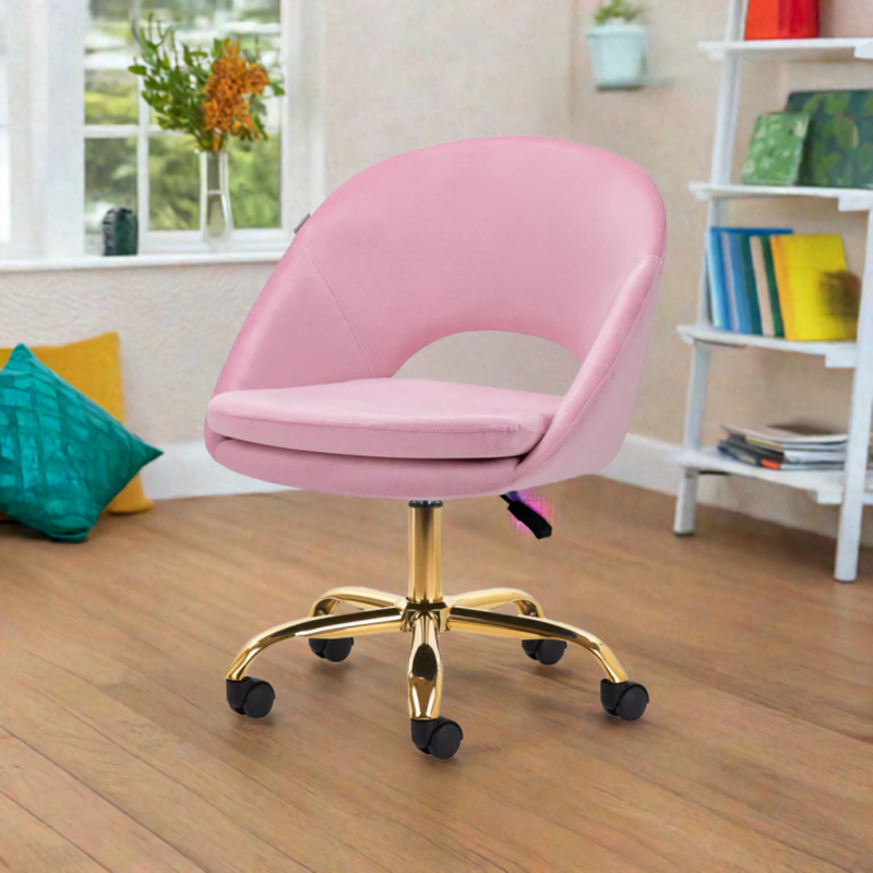 Proste wykończenie sprawia, że mebel wpada w oko. Przyjemne w dotyku, welwetowe obicie w odcieniach różu nadaje mu wyjątkowego charakteru. Podstawa w odcieniach złota dodaje elegancji, idealnie komponując się z welwetem, a funkcjonalne koła zapewniają mobilność, ułatwiając przestawianie krzesła oraz poruszanie się po salonie w trakcie pracy. Estetyka wykonania, komfort użytkowania oraz ergonomicznie wyprofilowane oparcie sprawiają, że krzesło spełni wymagania nawet najbardziej wymagających użytkowników.