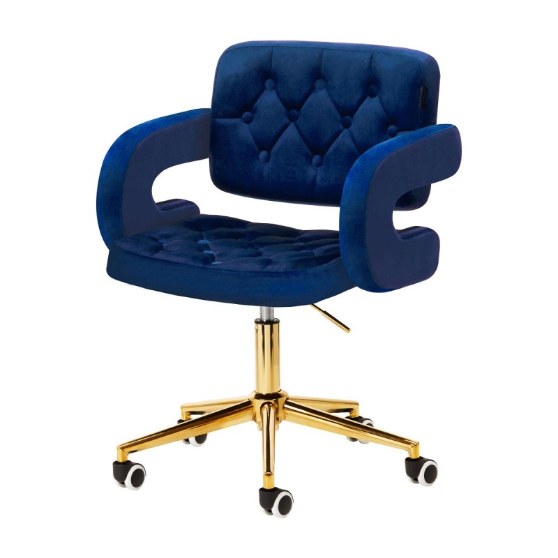 Przyjemne w dotyku, welwetowe obicie w odcieniach granatu nadaje meblowi wyjątkowego charakteru. Wykończenie sprawia, że mebel zapadnie w oko. Stelaż w odcieniach złota dodaje elegancji, idealnie komponując się z welwetem. Funkcjonalne koła zapewniają mobilność, ułatwiając przestawianie krzesła oraz poruszanie się po salonie w trakcie pracy. Estetyka wykonania, komfort użytkowania, ozdobne pikowanie oraz ergonomicznie wyprofilowane oparcie sprawiają, że krzesło spełni wymagania nawet najbardziej wymagających użytkowników.