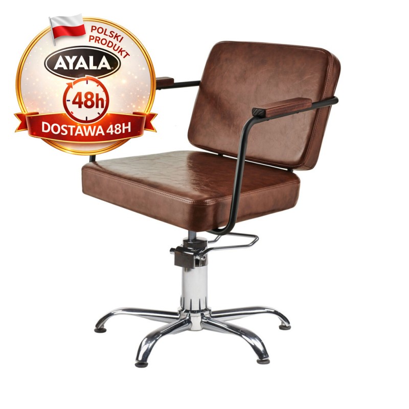 Brązowy Fotel Fryzjerski ENZO - Srebrna Pięcioramienna Podstawa - Ayala 48h zapewnia profesjonalny komfort i wydajność w kompaktowej, stylowej formie. Idealny do salonów w klimacie industrialnym i boho — szybka dostępność w ofercie 48h.