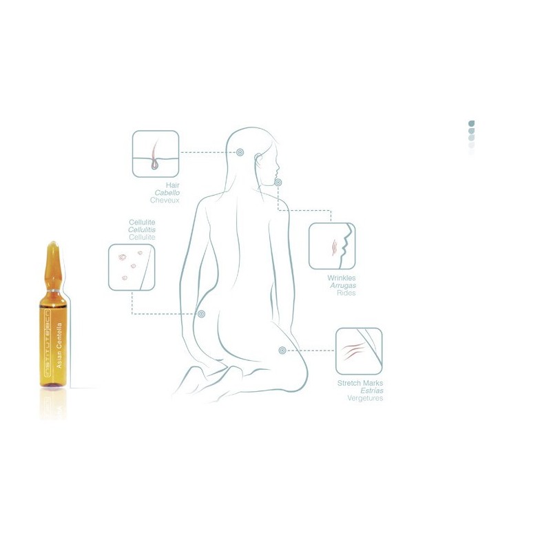 Centella Asiatica wzmacnia naczynia krwionośne i poprawia krążenie. Dzięki temu następuje zmniejszenie komórek tłuszczowych, zwiększenie elastyczności włókien tkanki łącznej i tym samym zmniejszenie cellulite.