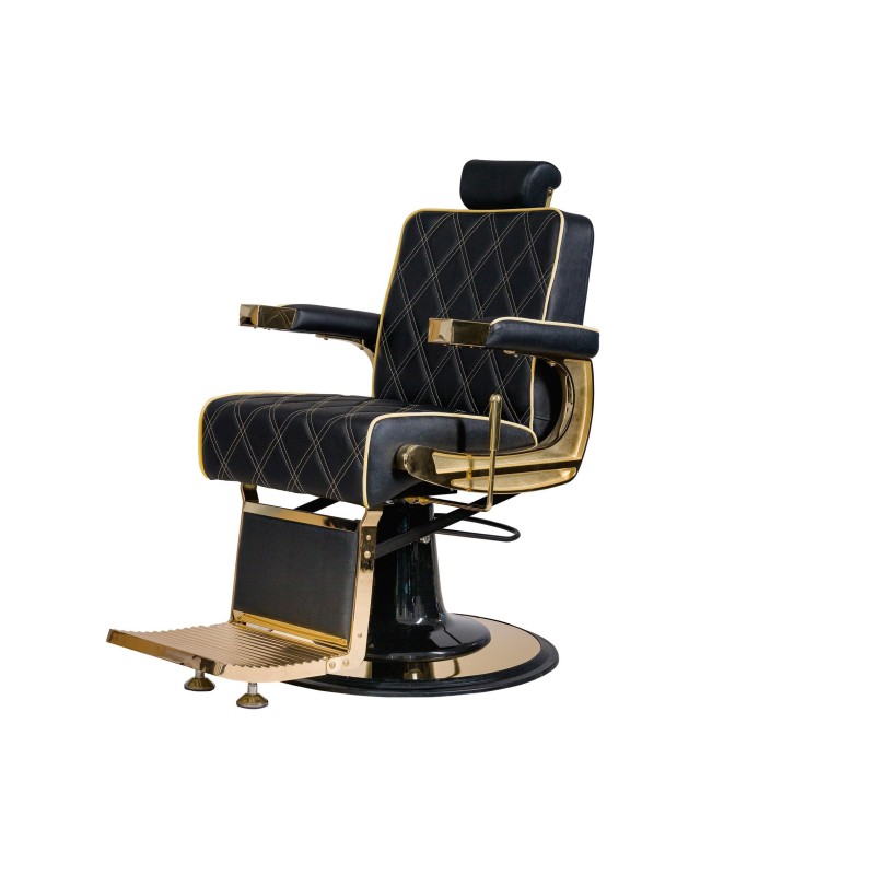 Czarna tapicerka wykonana z wysokiej jakości materiału PVC jest nie tylko elegancka, ale również praktyczna - łatwa do utrzymania w czystości i odporna na codzienne zużycie. Złote przeszycia i wykończenia dodają krzesłu luksusowego charakteru, podkreślając jego wyjątkowy design. To krzesło barberskie to idealne połączenie estetyki i funkcjonalności, które z pewnością podniesie prestiż każdego salonu i zapewni niezrównany komfort klientom.