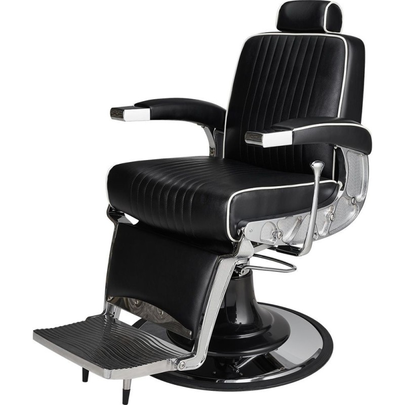 Fotel fryzjerski przeznaczony do salonów męskich typu Barber Shop. Solidna metalowa konstrukcja, eleganckie chromowane wykończenia. Podstawa fotela w kolorze białym. Tapicerka fotela dostępna w przedstawionym kolorze czarnym. Na brzegach fotela umieszczono zdobiącą kedrę w kolorze białym.