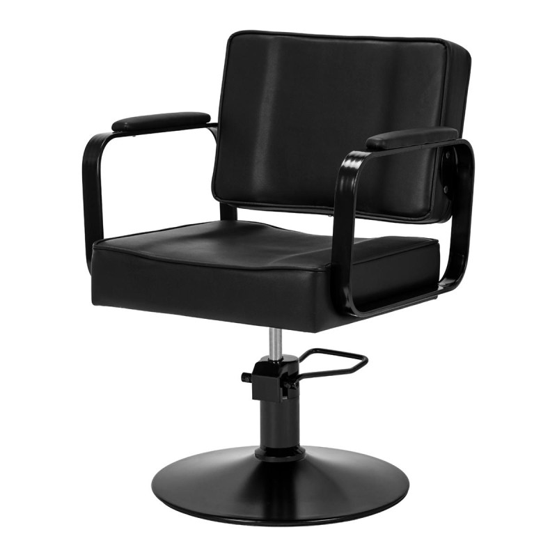 Wytrzymała konstrukcja i obicie z czarnej skóry syntetycznej zapewniają odporność na wilgoć, trwałość i solidność fotela. Okrągła podstawa w tym samym odcieniu gwarantuje stabilność i bezpieczeństwo użytkowania. Minimalistyczny design sprawia, że fotel doskonale komponuje się z różnymi stylami wnętrz salonów fryzjerskich, wprowadzając elegancki i nowoczesny akcent.