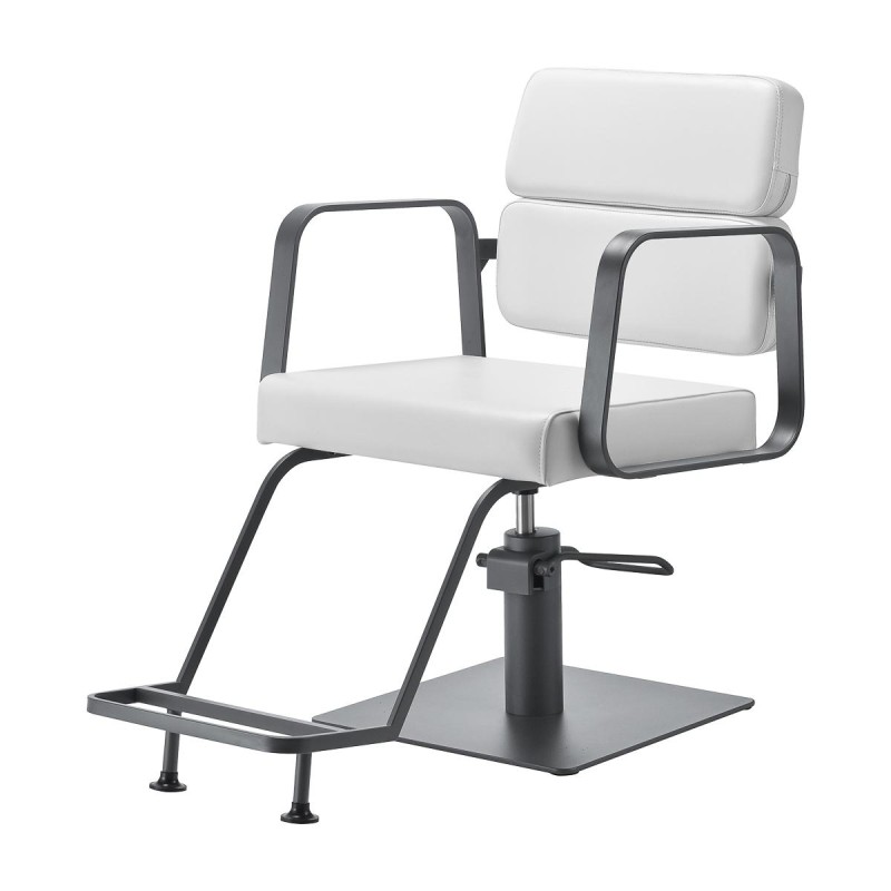 Mechanizm pełnego obrotu sprawia, że praca staje się bardziej efektywna i wygodna. Solidna, płaska podstawa w kształcie kwadratu gwarantuje stabilność w trakcie użytkowania. Matowo wykończona powierzchnia nadaje elementowi elegancki wygląd i sprawia, że ten jest łatwy do utrzymania w czystości. Wygodne siedzisko z wypełnieniem z pianki zapewnia wysoki komfort, a metalowe podłokietniki pozwalają na prawidłowe ułożenie barków klienta, co ułatwia wykonywanie precyzyjnych strzyżeń. Dedykowany podnóżek zapewnia stabilne oparcie dla stóp.