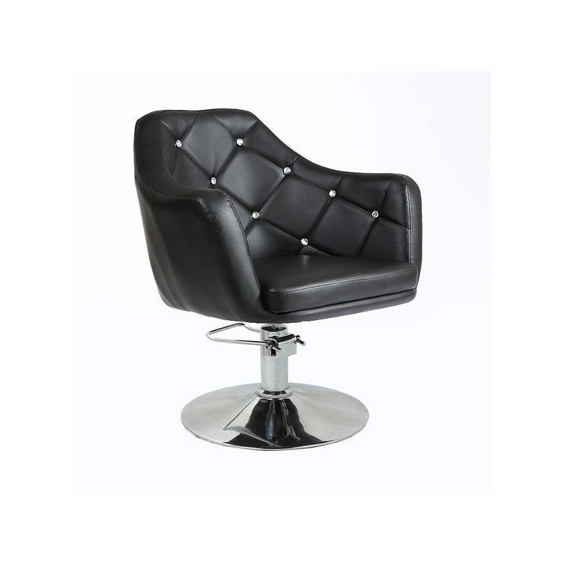 Ekskluzywny fotel fryzjerski tapicerowany ekologiczną skórą z wnętrzem obicia wysadzanym kryształkami Wygodne i miękkie podłokietniki połączone z oparciem pod lekkim łukiem. Fotel wyposażony jest w regulację wysokości na siłowniku hydraulicznym.