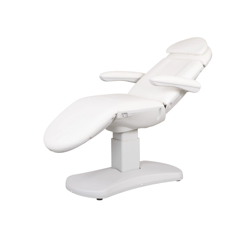 Wysokiej jakości fotel kosmetyczny elektryczny wyposażony w 3 silniki Zdejmowane i obrotowe podłokietniki dają optymalnie większą możliwość ergonomii i dostępu podczas wykonywanych zabiegów. Mebel ten posiada bezszwową tapicerkę, dzięki czemu higiena fotela kosmetycznego jest prosta i nieskomplikowana.