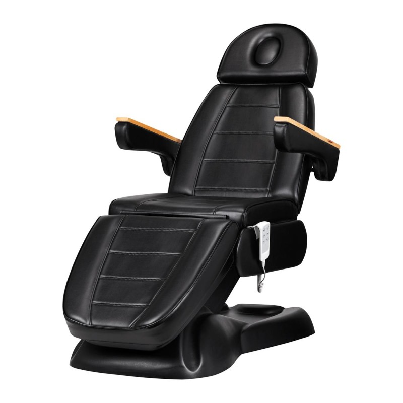 Fotel wypełniony jest pianką o odpowiedniej twardości oraz pokryty przyjemną w dotyku imitacją skóry w odcieniach czerni. Dzięki użyciu materiału, który jest łatwy do utrzymania w czystości oraz odporny na wybrane środki dezynfekcji, sprzęt jest komfortowy w użytkowaniu, wytrzymały na wilgoć oraz nieskomplikowany w czyszczeniu. Solidna podstawa wykonana z trwałego materiału w odcieniach czerni zapewnia stabilność w trakcie zabiegów. Ozdobne drewniane elementy na podłokietnikach wyróżniają fotel pośród innych modeli, stanowiąc atrakcyjny wizualnie, elegancki akcent. Odpowiednio wyprofilowane obszycia nadają fotelowi stylowy wygląd i sprawiają, że siedzisko jest ergonomiczne.