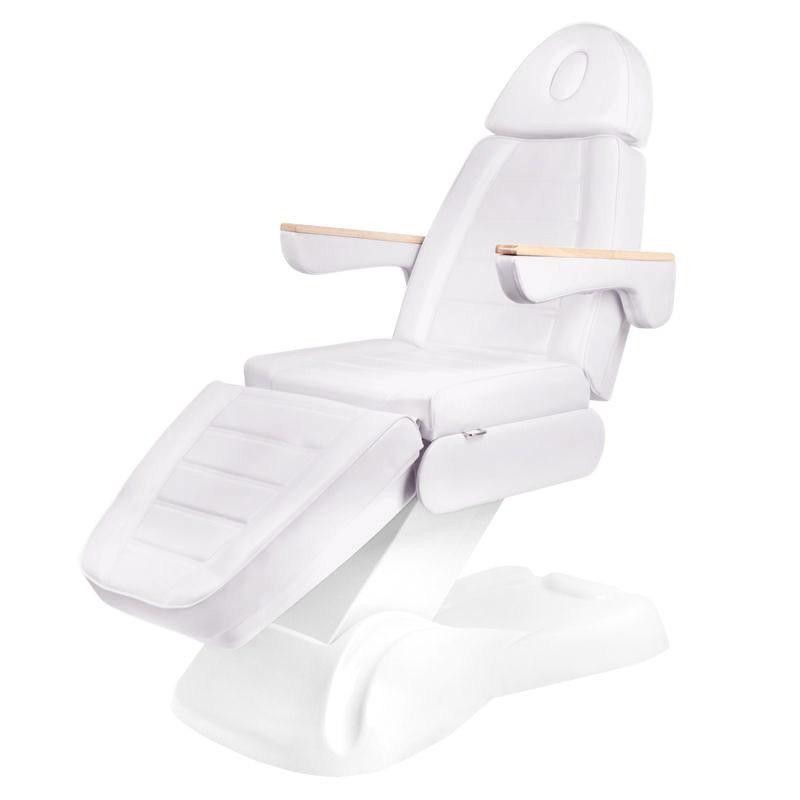 Fotel wypełniony jest pianką o odpowiedniej twardości oraz pokryty przyjemną w dotyku imitacją skóry w odcieniach bieli. Dzięki użyciu materiału, który jest łatwy do utrzymania w czystości oraz odporny na wybrane środki dezynfekcji, sprzęt jest komfortowy w użytkowaniu, wytrzymały na wilgoć oraz nieskomplikowany w czyszczeniu. Solidna podstawa wykonana z trwałego materiału w odcieniach bielizapewnia stabilność w trakcie zabiegów. Ozdobne drewniane elementy na podłokietnikach wyróżniają fotel pośród innych modeli, stanowiąc atrakcyjny wizualnie, elegancki akcent. Odpowiednio wyprofilowane obszycia nadają fotelowi stylowy wygląd i sprawiają, że siedzisko jest ergonomiczne.