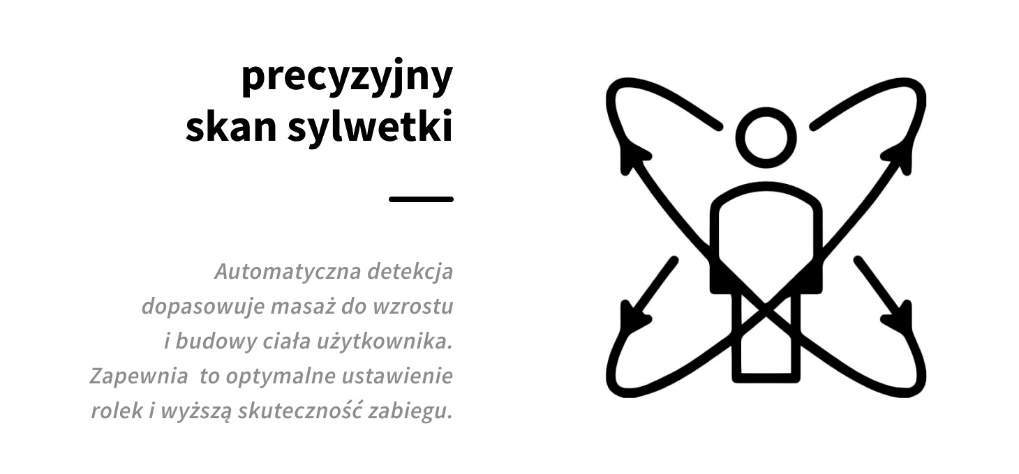 Automatyczny skan sylwetki precyzyjnie dopasowuje masaż do indywidualnych parametrów użytkownika. Rozpoznanie wzrostu, położenia barków oraz budowy ciała pozwala ustawić rolki masujące, co przekłada się na optymalne dopasowanie masażu i wyższą skuteczność jego działania. Podczas procesu skanowania rolki poruszają się w górę i w dół, a możliwość korekty ustawień z poziomu panelu sterowania pozwala na dodatkowe dopasowanie masażu do osobistych preferencji, zwiększając komfort i efektywność każdej sesji.