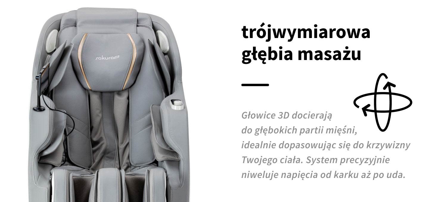 Technologia masażu 3D umożliwia precyzyjne odwzorowanie ruchów ludzkich dłoni, zapewniając intensywny i wysoce skuteczny masaż. Cztery głowice masujące pracują w trzech wymiarach – poruszając się w górę i w dół, w przód i w tył oraz w głąb tkanek mięśniowych. Takie działanie pozwala na dokładne dopasowanie masażu do naturalnej krzywizny ciała oraz potrzeb użytkownika, skutecznie rozluźniając napięte mięśnie. Dzięki temu możliwe jest dokładne rozmasowanie wszystkich partii pleców – od karku, poprzez łopatki, aż po dolną część pleców i górne partie ud – co przekłada się na wyraźne zmniejszenie napięć i odczuwalną poprawę komfortu.