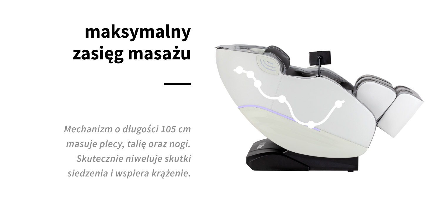Ścieżka masażu rolkami w modelu Maximus 809 obejmuje długość 105 centymetrów – od karku aż po górne partie nóg. Zakres działania uwzględnia całe plecy, w tym odcinek piersiowy i lędźwiowy kręgosłupa, a także talię, biodra, pośladki oraz uda. Tak rozbudowana ścieżka masażu pozwala na równomierne i kompleksowe opracowanie zarówno górnych, jak i dolnych partii ciała, zapewniając głębokie rozluźnienie mięśni i wyraźną poprawę komfortu. Masaż wspiera krążenie krwi, pomaga redukować napięcia mięśniowe oraz sprzyja regeneracji organizmu po długotrwałym siedzeniu, intensywnym dniu pracy lub wysiłku fizycznym.