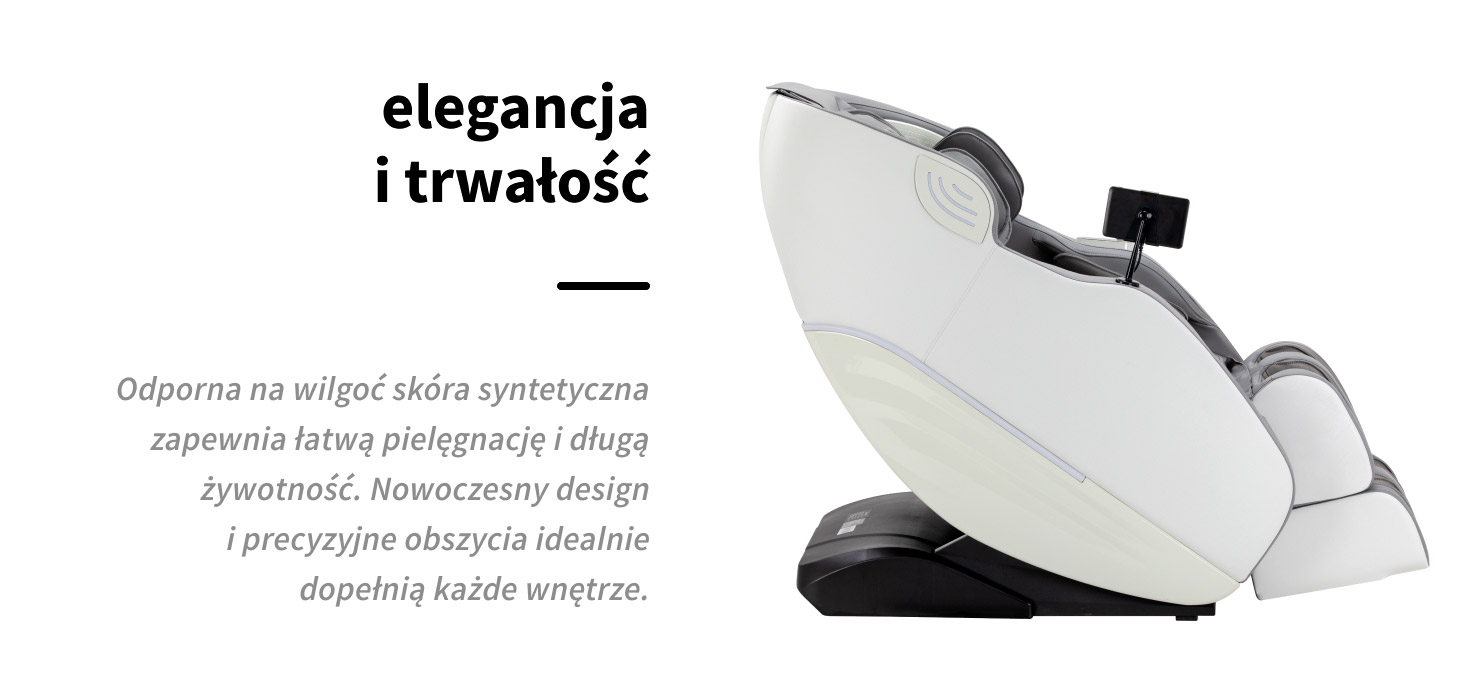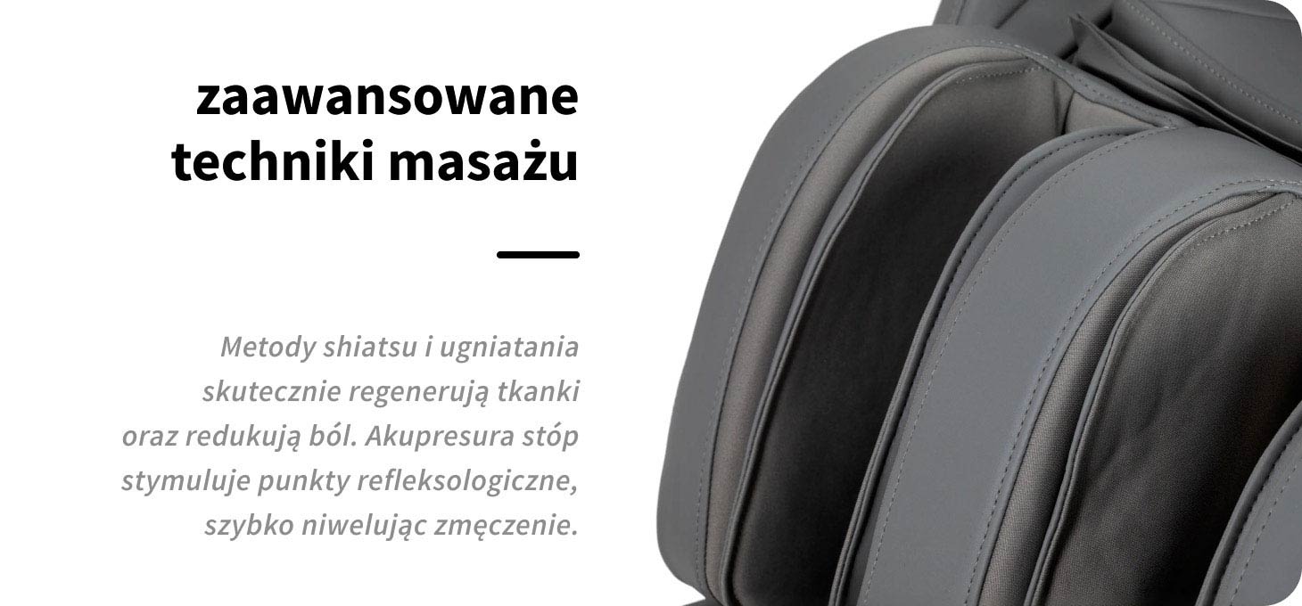 Zastosowane technologie masażu opierają się na precyzyjnie dobranych i wzajemnie uzupełniających się technikach, takich jak kneading (ugniatanie), knocking (pukanie), tapping (stukanie) oraz shiatsu. Ich różnorodne kombinacje pozwalają na skuteczne opracowanie tkanek mięśniowych, wspierając naturalne procesy regeneracyjne organizmu oraz pomagając w redukcji napięć i dolegliwości bólowych. Dodatkowo wbudowany masażer stóp wykorzystuje technikę akupresury, oddziałując na kluczowe punkty refleksologiczne. Precyzyjny nacisk sprzyja głębokiemu rozluźnieniu oraz skutecznie redukuje uczucie zmęczenia stóp.