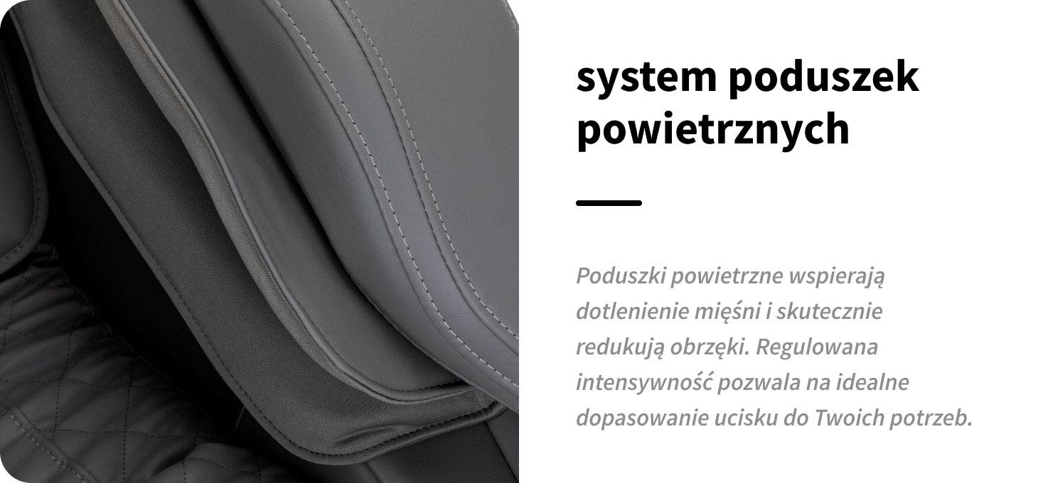 Masaż uciskowy, oparty na pracy 18 poduszek powietrznych, stanowi doskonałe uzupełnienie pracy głowic masujących. Pulsujące działanie w obrębie stóp, pięt, łydek, rąk i barków wspiera drenaż limfatyczny, usprawnia krążenie oraz przyspiesza proces detoksykacji organizmu. Efektem jest lepsze dotlenienie i odżywienie mięśni, widoczna redukcja napięć oraz odczuwalne poczucie ulgi, które może utrzymywać się przez wiele godzin po masażu. Intensywność pracy poduszek można łatwo dostosować z poziomu panelu sterowania, co pozwala dopasować zabieg do indywidualnych potrzeb użytkownika i zwiększyć jego komfort.