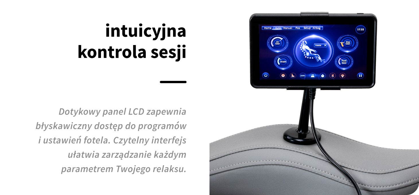 Panel sterowania umożliwia łatwe dostosowanie masażu do indywidualnych potrzeb. Dla większej wygody można umieścić go w uchwycie na prawym podłokietniku lub trzymać w dłoniach. Na ekranie wyraźnie prezentowane są wszystkie kluczowe informacje – aktualnie masowane partie ciała, intensywność masażu, czas trwania sesji oraz wybrany program. Panel pozwala przełączać się między trybami automatycznymi i manualnymi oraz włączać sterowanie głosem, zwiększając komfort obsługi. Za jego pomocą można wygodnie wybierać spośród dostępnych trybów masażu, regulować intensywność, dopasować ustawienia fotela i precyzyjnie dostosowywać czas sesji w odstępach co 5 minut (5, 10, 15, 20, 25 lub 30 minut), zapewniając idealną długość masażu dopasowaną do potrzeb użytkownika.