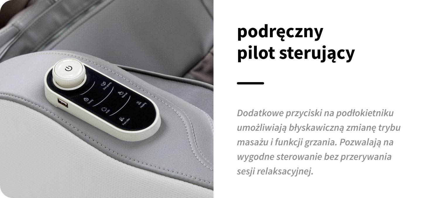 Dla zwiększenia wygody fotel wyposażono w dodatkowy zestaw przycisków sterujących umieszczonych na lewym podłokietniku. Wbudowany podręczny pilot zapewnia szybki dostęp do najważniejszych funkcji bez konieczności sięgania po główny panel. Dzięki temu użytkownik może w prosty sposób zmieniać rodzaj masażu, uruchamiać masaż stóp, aktywować funkcję podgrzewania oraz funkcję Zero Gravity, co pozwala w pełni kontrolować komfort i intensywność relaksu w każdej chwili.
