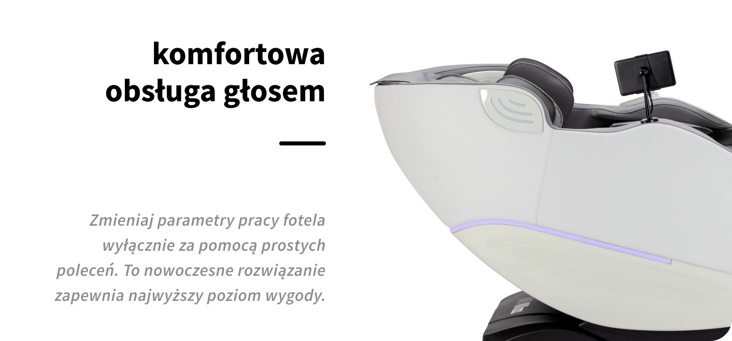Fotel do masażu wyposażony jest w funkcję sterowania głosowego, umożliwiającą wygodną obsługę bez użycia rąk. Za pomocą prostych komend można rozpocząć lub zakończyć masaż, wybrać tryb pracy, a także regulować działanie poduszek powietrznych oraz intensywność masażu. Rozwiązanie to zwiększa komfort użytkowania, umożliwia pełne odprężenie i pozwala całkowicie skupić się na relaksie, bez konieczności sięgania po panel sterowania.