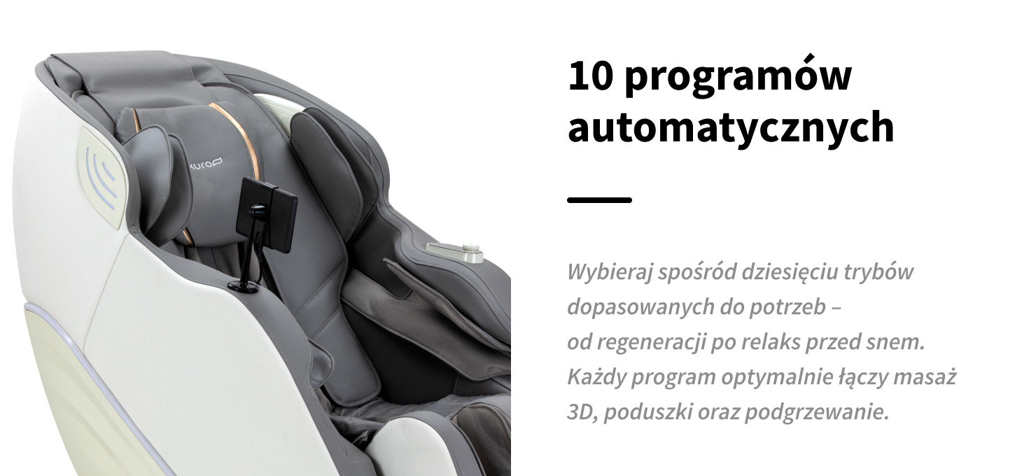 Fotel ma zaprogramowanych dziesięć trybów masażu, opracowanych z myślą o różnorodnych potrzebach użytkowników – od regeneracji po relaks przed snem. Każdy program łączy precyzyjną pracę głowic masujących, aktywność poduszek powietrznych, regulację kąta nachylenia, funkcję Zero Gravity oraz opcję podgrzewania, zapewniając kompleksowe dopasowanie masażu do ciała i aktualnego samopoczucia. Wystarczy wybrać odpowiedni tryb z poziomu panelu sterowania, aby cieszyć się optymalnym relaksem, maksymalnym komfortem i skutecznym rozluźnieniem mięśni.
