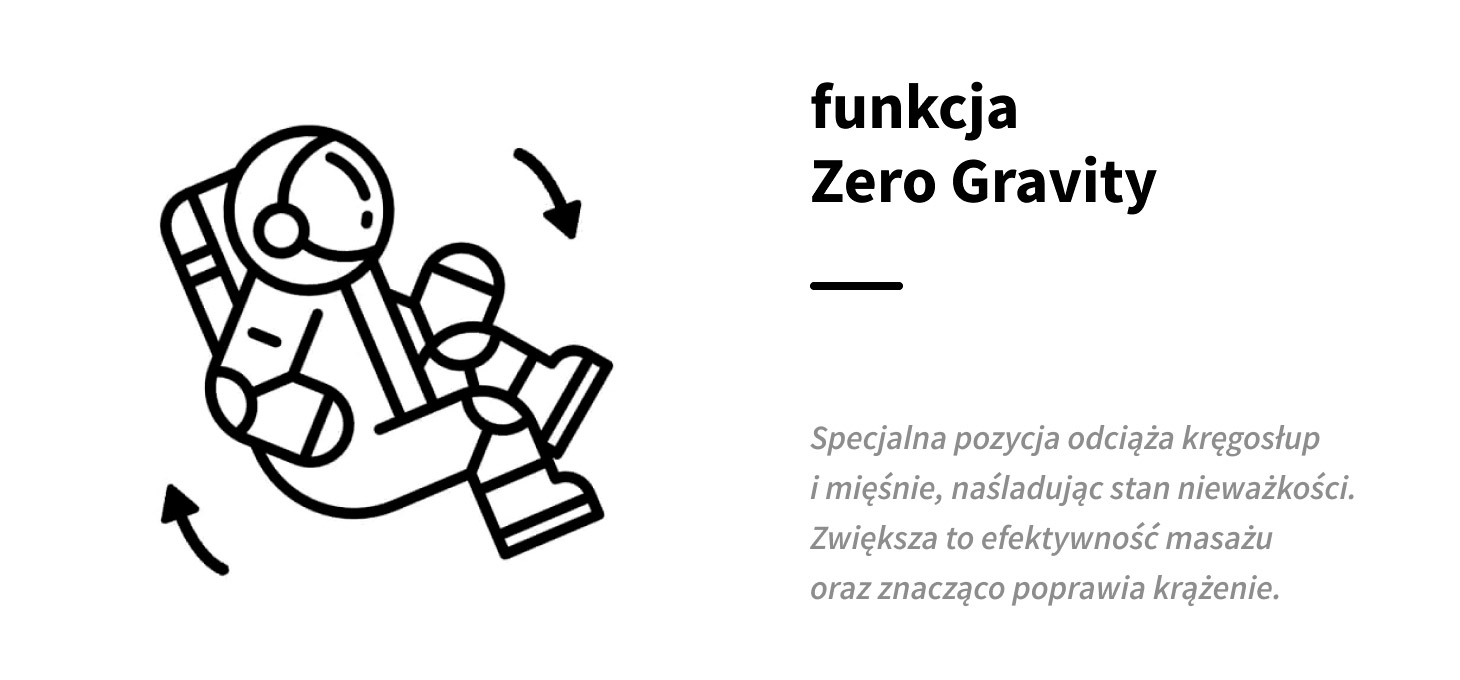 Fotel pozwala na regulację kąta nachylenia, umożliwiając ustawienie go w pozycji o wyjątkowo korzystnym wpływie na ciało. Inspiracją dla tej funkcji była pozycja przyjmowana przez astronautów podczas startu rakiety, minimalizująca nacisk grawitacyjny na organizm. Pozycja Zero Gravity równomiernie rozkłada ciężar ciała na całej powierzchni fotela, zmniejszając obciążenie kręgosłupa, rozluźniając mięśnie oraz wspomagając krążenie krwi i limfy. Dzięki temu masaż staje się bardziej efektywny, a użytkownik może w pełni doświadczyć odprężenia i regeneracji organizmu.
