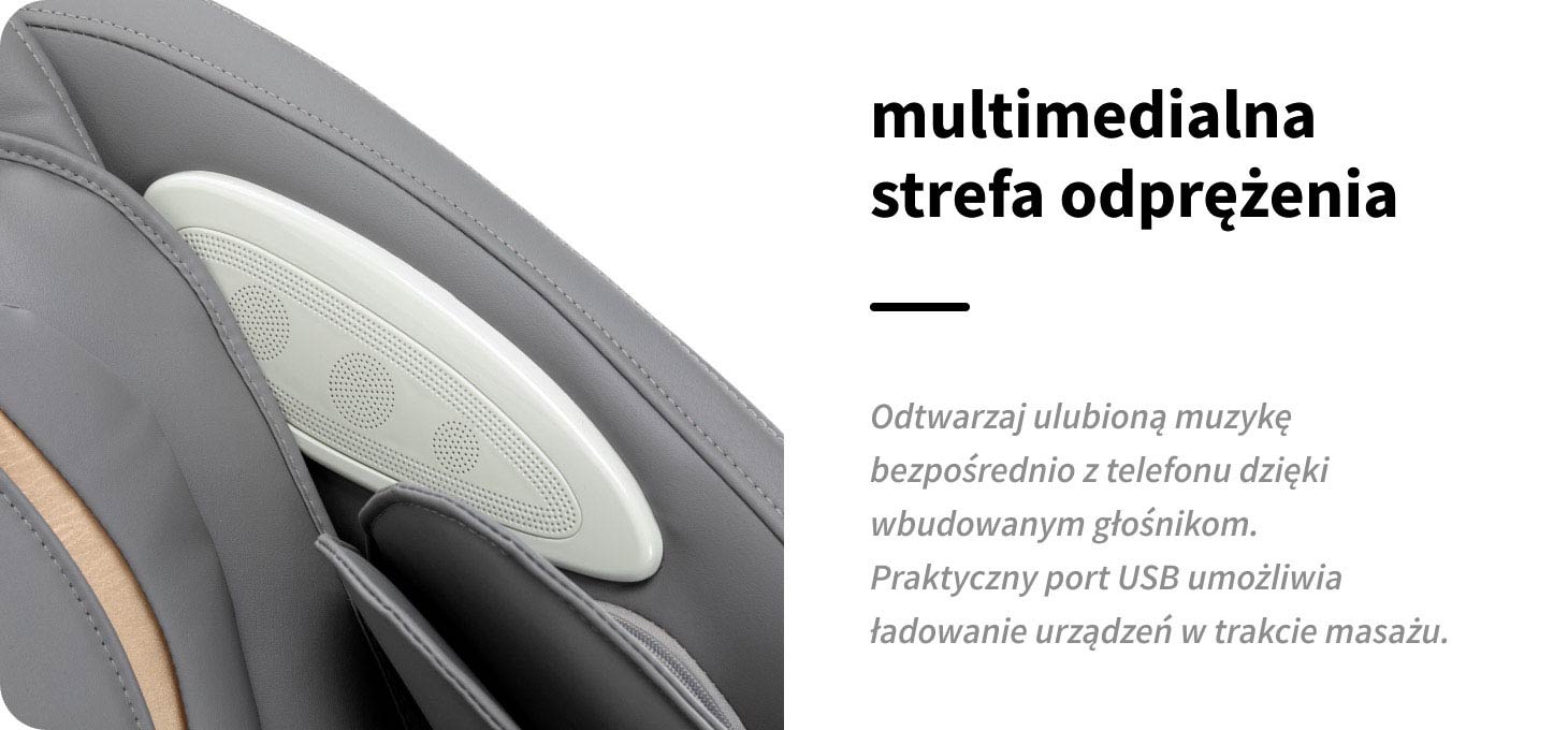 Dla zwiększenia komfortu i relaksu fotel masujący umożliwia połączenie z telefonem za pomocą technologii Bluetooth, dzięki czemu podczas sesji można odtwarzać ulubioną muzykę relaksacyjną. Spokojne dźwięki pomagają wyciszyć umysł, poprawiają samopoczucie i pozwalają w pełni odprężyć ciało. Dodatkowo fotel wyposażony jest w port USB, umożliwiający ładowanie urządzeń mobilnych w trakcie masażu.