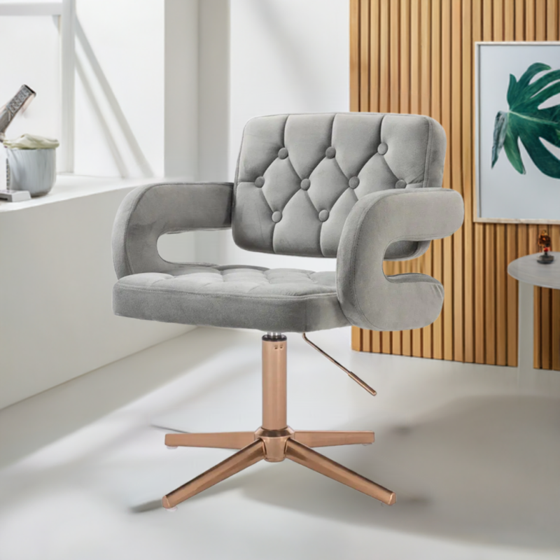 Fotel SURF Cross Stalowy Welur Złota Podstawa łączy elegancję z wygodą, idealny do nowoczesnych wnętrz i gabinetów. Miękkie siedzisko, pikowane guziki i złota podstawa tworzą efektowny akcent w każdym pomieszczeniu.