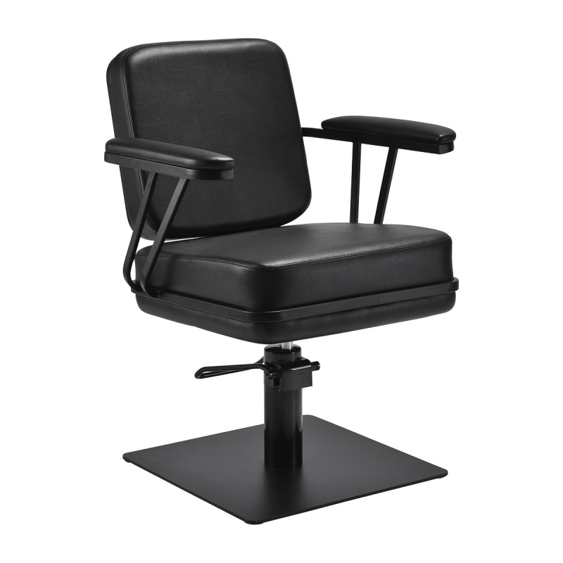 Wyprofilowany fotel zapewnia wsparcie lędźwi i wysoki komfort użytkowania, a tapicerowane podłokietniki umożliwiają prawidłowe ułożenie barków klienta. Stabilna, kwadratowa podstawa w matowej czerni podkreśla stylowy wygląd, a przyjemna w dotyku skóra syntetyczna w odcieniach czerni gwarantuje wygodę podczas długich zabiegów, trwałość, odporność na wilgoć i łatwość czyszczenia. Nowoczesny design nadaje wnętrzu wyjątkowego charakteru, a fotel sprawdza się zarówno w nowoczesnych, jak i klasycznych aranżacjach, podkreślając profesjonalny wizerunek salonu.