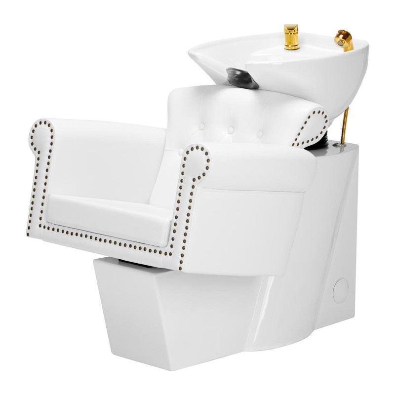 Odpowiednio wyprofilowany fotel wypełniony trwałą pianką zapewnia odpowiednie wsparcie, a co za tym idzie wysoki komfort użytkowania. Podłokietniki pozwalają na prawidłowe ułożenie barków klienta. Przyjemne w dotyku pokrycie ze skóry syntetycznej w odcieniach bieli zapewnia wieloletnią trwałość oraz łatwość czyszczenia. Oryginalny, elegancki wygląd myjni z ozdobnym pikowaniem i złotymi elementami nadaje wnętrzom niepowtarzalnego wyrazu. W zestawie znajduje się kompletna armatura w odcieniach złota, w tym bateria, słuchawka prysznicowa oraz dedykowane węże, aby zapewnić całkowity zestaw narzędzi do pracy.