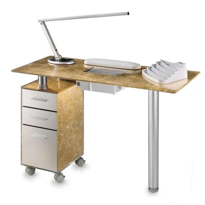 Klasyczny stolik do manicure, dostępny w wersji z pochłaniaczem pyłu lub bez. W zestawie znajdują się pufka pod dłoń oraz lampka.