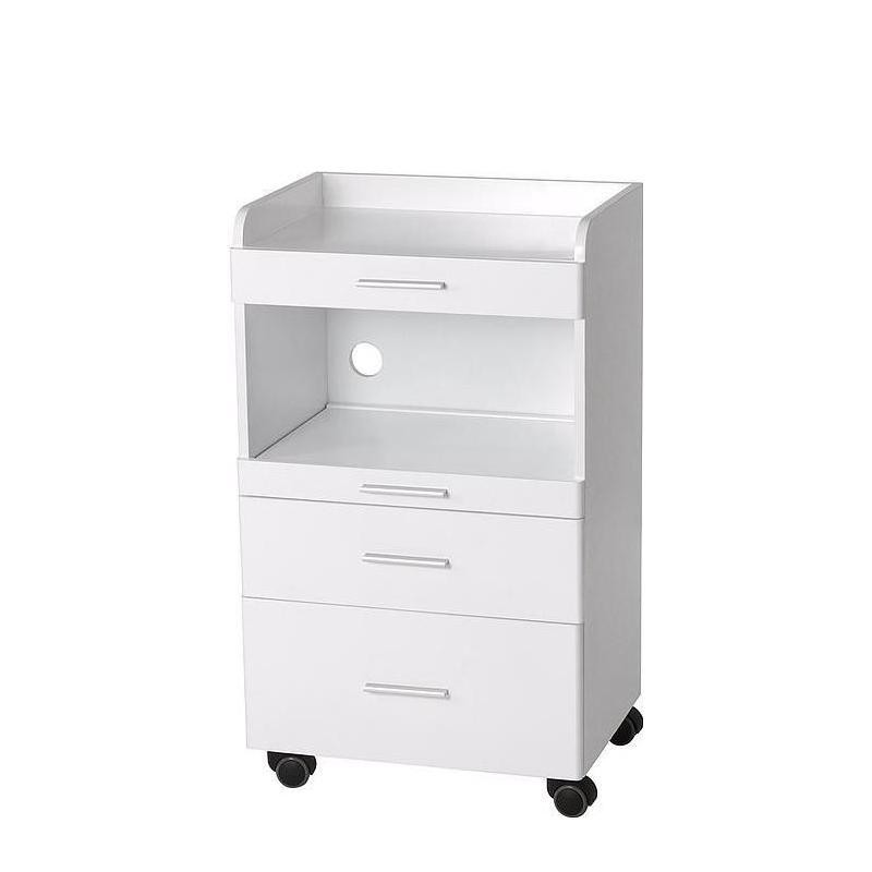 Klasyczny pomocnik kosmetyczny z miejscem na sprzęt zabiegowy i dwiema szufladkami. Elegancki design, wykonany z drewna lakierowanego na biało. Wyposażona w 3 szuflady i centralną