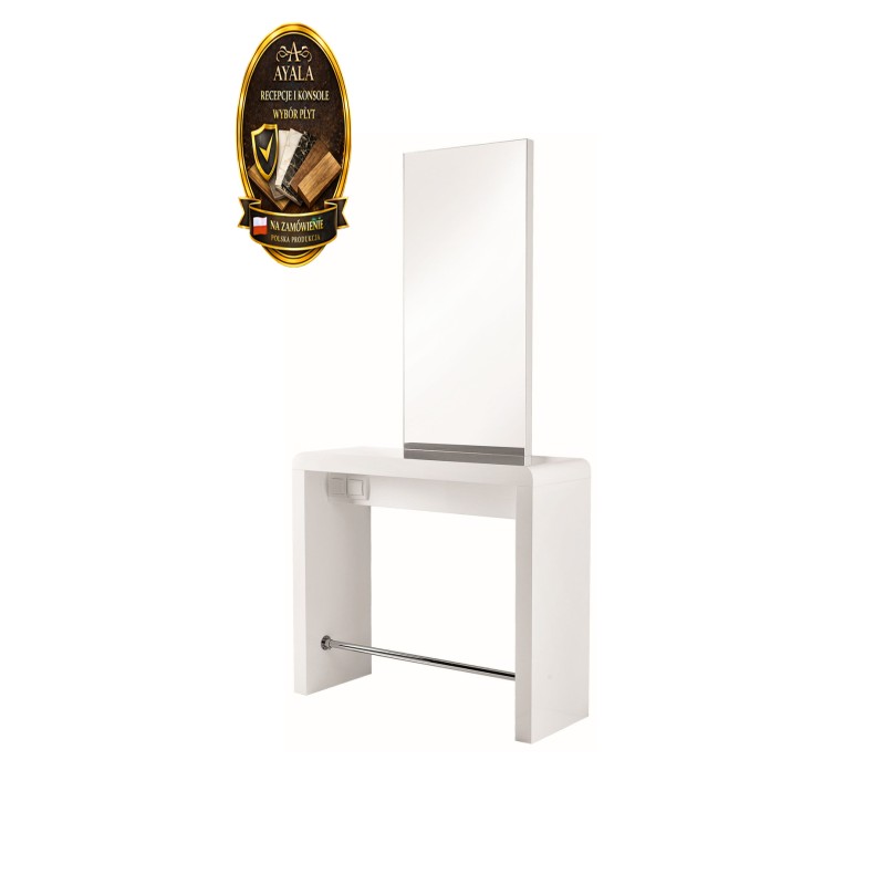 Nowoczesna konsoleta fryzjerska wykonana z płyty na wysoki połysk. Dostępna w kolorze białym lub czarnym. Za dopłatą istnieje możliwość wykonania recepcji w kolorach z palety RAL(wycena indywidualna). Konsoleta posiada chromowany podnóżek oraz podwójne gniazdo elektryczne. Konstrukcja montowana do ściany.