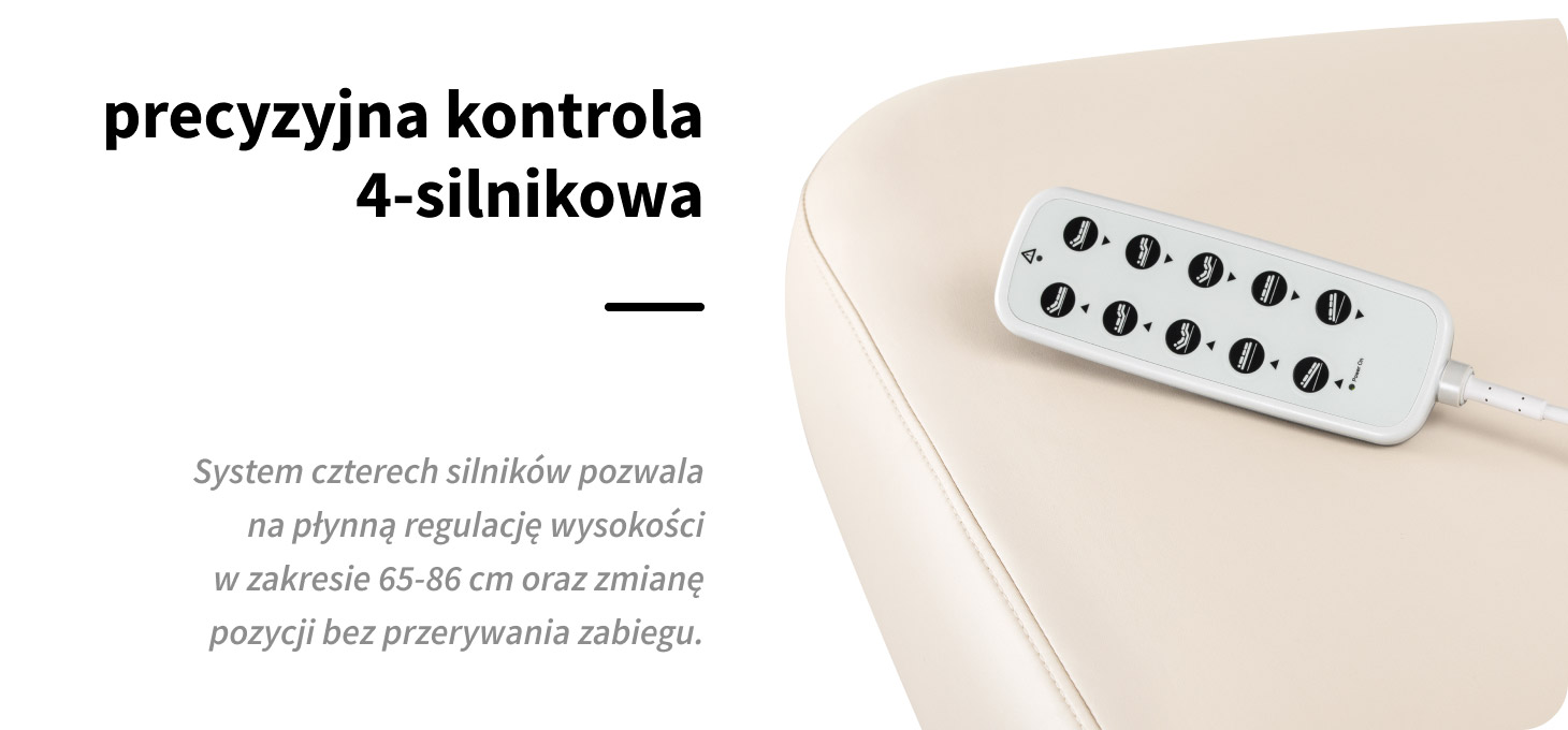 Intuicyjny pilot umożliwia płynną regulację w czterech płaszczyznach – obejmującą wysokość, kąt nachylenia oparcia, podnóżka oraz funkcję kołyski. Elektryczna regulacja wysokości w zakresie 65-86 cm oraz precyzyjna zmiana kątów nachylenia pozwalają idealnie dopasować pozycję leżanki do rodzaju wykonywanego zabiegu. Szeroki zakres regulacji ułatwia zachowanie ergonomicznej pozycji pracy – niezależnie od wzrostu specjalisty czy specyfiki procedury. Możliwość jednoczesnej regulacji oparcia i podnóżka za pomocą jednego przycisku pozwala szybko ustawić pozycję siedzącą, półleżącą lub leżącą – bez konieczności przerywania zabiegu. Płynna zmiana ustawień wspiera ergonomię pracy oraz zwiększa komfort klienta na każdym etapie procedury.
