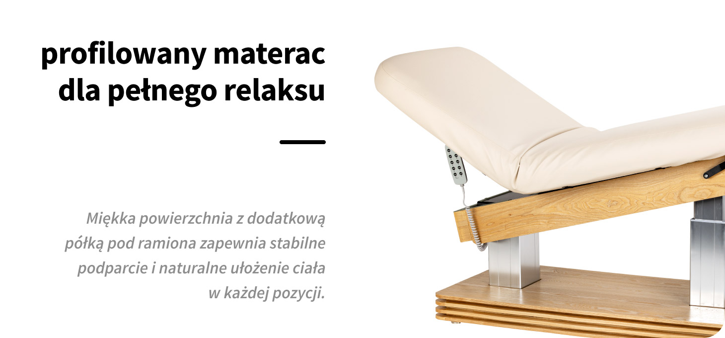 Profilowana powierzchnia leżanki sprzyja naturalnemu, wygodnemu ułożeniu ciała, zapewniając stabilne i komfortowe podparcie na całej długości. Odpowiednia szerokość oraz miękki materac podnoszą wygodę klienta, szczególnie podczas dłuższych zabiegów. Większy komfort oznacza lepsze doświadczenie zabiegowe i wyższy standard usług w gabinecie. Dodatkowa półka pod ramiona zwiększa wygodę w pozycji leżenia na brzuchu, odciążając górną część ciała i wspierając pełne rozluźnienie.
