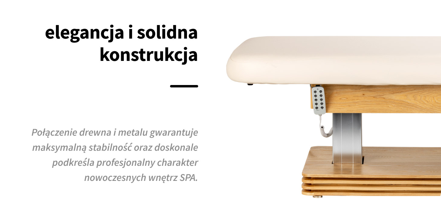 Nowoczesna leżanka zabiegowa z solidną, drewniano-metalową podstawą zapewnia maksymalną stabilność oraz bezpieczeństwo podczas wykonywania zabiegów. Trwała konstrukcja gwarantuje pewne podparcie, dzięki czemu zabiegi kosmetyczne, pielęgnacyjne, relaksacyjne oraz masaże przebiegają w komfortowych warunkach – zarówno dla klienta, jak i specjalisty. Starannie dopracowane detale oraz stonowana kolorystyka sprawiają, że leżanka kosmetyczna do salonu masażu i strefy wellness doskonale wpisuje się w eleganckie, profesjonalne wnętrza. Estetyka i solidność wykonania przekładają się na wyższy standard usług, wzmacniają zaufanie klientów oraz podnoszą postrzeganą wartość zabiegów oferowanych w gabinecie.