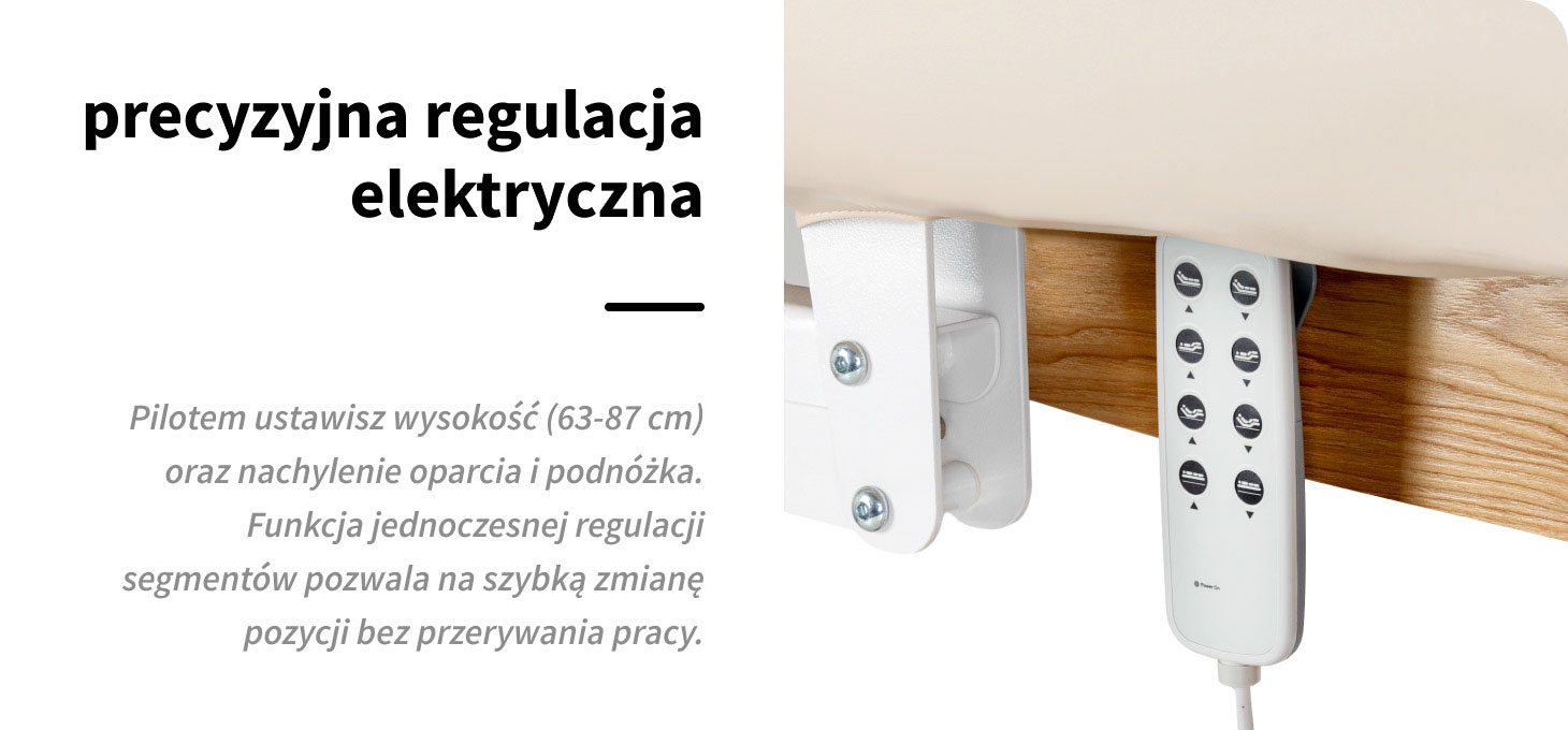 Leżanka wyposażona jest w elektryczną regulację wysokości w zakresie 63-87 cm oraz kąta nachylenia oparcia i części podnóżkowej, co pozwala precyzyjnie dopasować pozycję do rodzaju wykonywanego zabiegu. Szeroki zakres regulacji ułatwia przyjęcie ergonomicznej pozycji pracy, niezależnie od wzrostu specjalisty czy specyfiki procedury. Sterowanie odbywa się za pomocą praktycznego pilota, którego czytelnie oznaczone przyciski umożliwiają intuicyjną obsługę wszystkich funkcji, co przekłada się na wygodę obsługi i płynność pracy w gabinecie. Jednoczesna regulacja oparcia i podnóżka jednym przyciskiem pozwala błyskawicznie ustawić pozycję siedzącą, półleżącą lub leżącą – bez przerywania zabiegu. Płynna zmiana ustawień wspiera ergonomię pracy i podnosi komfort klienta na każdym etapie procedury.