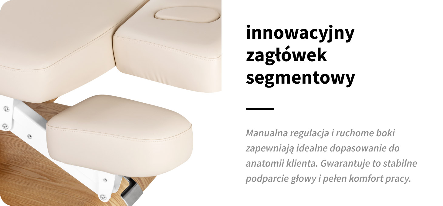 Zagłówek został zaprojektowany z myślą o maksymalnym komforcie klienta i funkcjonalności pracy specjalisty. Główna część jest regulowana manualnie, umożliwiając ustawienie optymalnej pozycji podparcia głowy, natomiast boczne segmenty poruszają się w górę i w dół, dopasowując się do indywidualnej anatomii klienta do głowy i szyi klienta. Takie rozwiązanie zapewnia wygodne ułożenie podczas zabiegów, podtrzymanie prawidłowej pozycji oraz zwiększa komfort zarówno klienta, jak i osoby wykonującej zabieg.