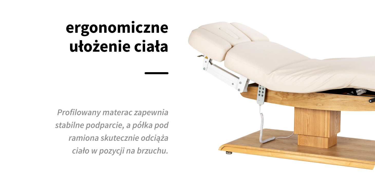 Profilowana powierzchnia leżanki zabiegowej sprzyja naturalnemu ułożeniu ciała, zapewniając stabilne i komfortowe podparcie na całej długości. Odpowiednia szerokość oraz miękki materac podnoszą wygodę klienta, szczególnie podczas dłuższych zabiegów. Większy komfort oznacza lepsze doświadczenie zabiegowe i wyższy standard usług w gabinecie. Dodatkowa półka pod ramiona zwiększa wygodę w pozycji leżenia na brzuchu, odciążając górną część ciała i wspierając pełne rozluźnienie.