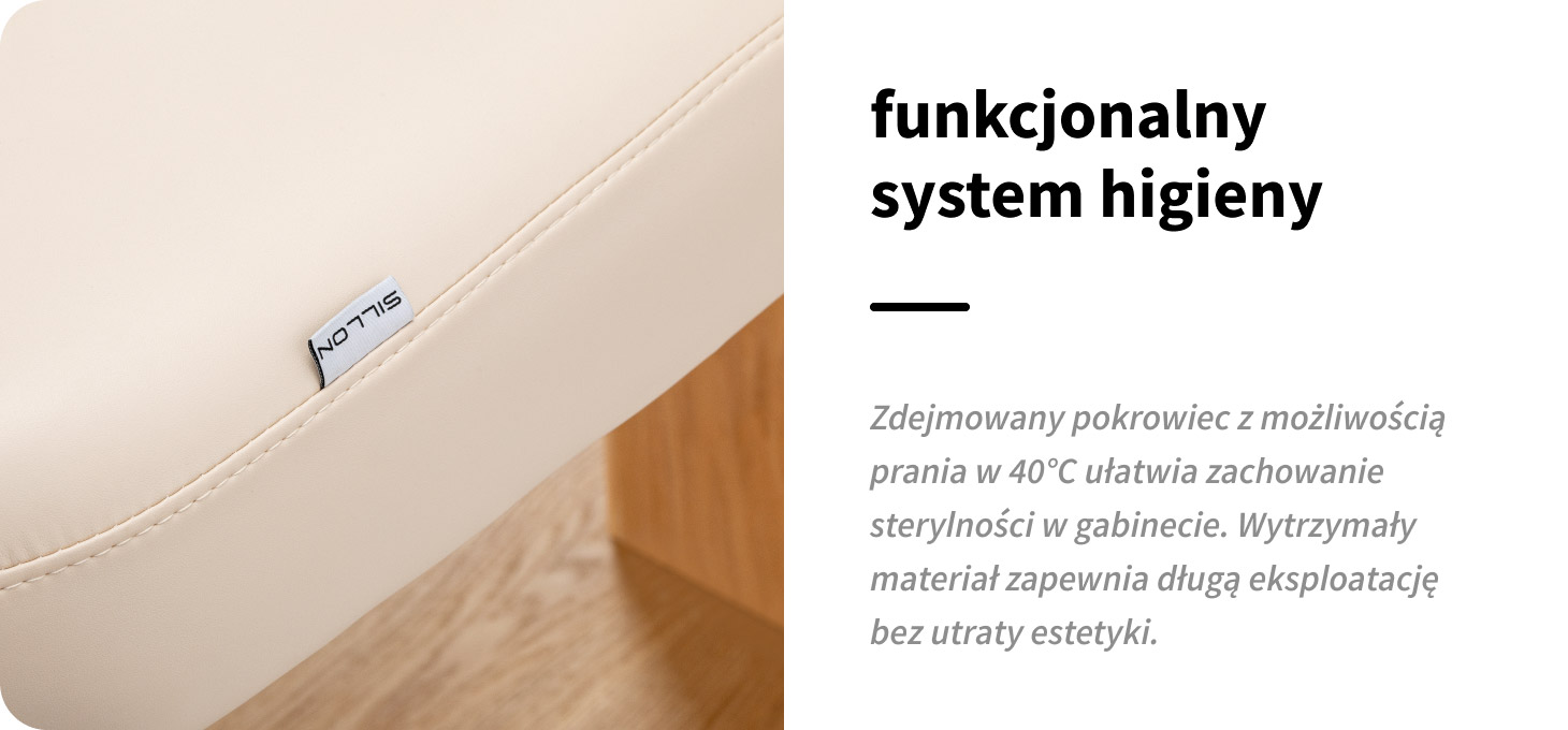 Zdejmowany pokrowiec na materac to realne ułatwienie w codziennej pracy. Możliwość szybkiego zdjęcia i wyprania (ręcznie lub w pralce do 40°C) pozwala bez trudu utrzymać wysoki standard higieny w gabinecie. Krótkie suszenie w niskiej temperaturze przyspiesza ponowne przygotowanie stanowiska do pracy. Odpowiednia pielęgnacja bez użycia alkoholu i silnych środków czyszczących pomaga zachować estetyczny wygląd oraz trwałość materiału na dłużej.
