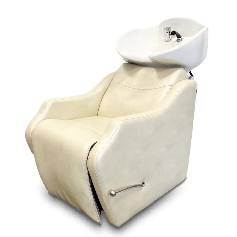 Ozdobne przeszycia nadają niepowtarzalny charakter myjni. Myjnia jest niezwykle elegancka nawiązuje do stylu barokowego. Jest masywna, a zarazem miękka i wygodna, co umożliwi poczuć klientowi komfort i odprężenie podczas wykonywanych zabiegów. W zestawie z ceramiczną misą i ruchomym podnóżkiem.