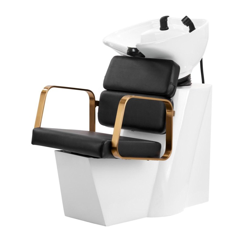 Wyprofilowany fotel zapewnia odpowiednie wsparcie lędźwi, a co za tym idzie wysoki komfort użytkowania. Metalowe podłokietniki w odcieniach złota o geometrycznym kształcie pozwalają na prawidłowe ułożenie barków klienta. Wypełnienie z trwałej, odpornej na odkształcenia pianki oraz obicie wykonane z przyjemnej w dotyku skóry syntetycznej w odcieniach czerni zapewniają trwałość mebla, łatwość czyszczenia i komfortowe użytkowanie przez długi czas. Oryginalny, elegancki wygląd myjni nadaje wnętrzom niepowtarzalnego wyrazu. W zestawie znajduje się kompletna armatura w odcieniach czerni, w tym bateria, słuchawka prysznicowa oraz dedykowane węże.