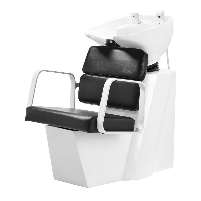Wyprofilowany fotel zapewnia odpowiednie wsparcie lędźwi, a co za tym idzie wysoki komfort użytkowania. Metalowe podłokietniki w odcieniach bieli o geometrycznym kształcie pozwalają na prawidłowe ułożenie barków klienta. Wypełnienie z trwałej, odpornej na odkształcenia pianki oraz obicie wykonane z przyjemnej w dotyku skóry syntetycznej w odcieniach czerni zapewniają trwałość mebla, łatwość czyszczenia i komfortowe użytkowanie przez długi czas. Oryginalny, elegancki wygląd myjni nadaje wnętrzom niepowtarzalnego wyrazu. W zestawie znajduje się kompletna armatura w odcieniach bieli, w tym bateria, słuchawka prysznicowa oraz dedykowane węże.