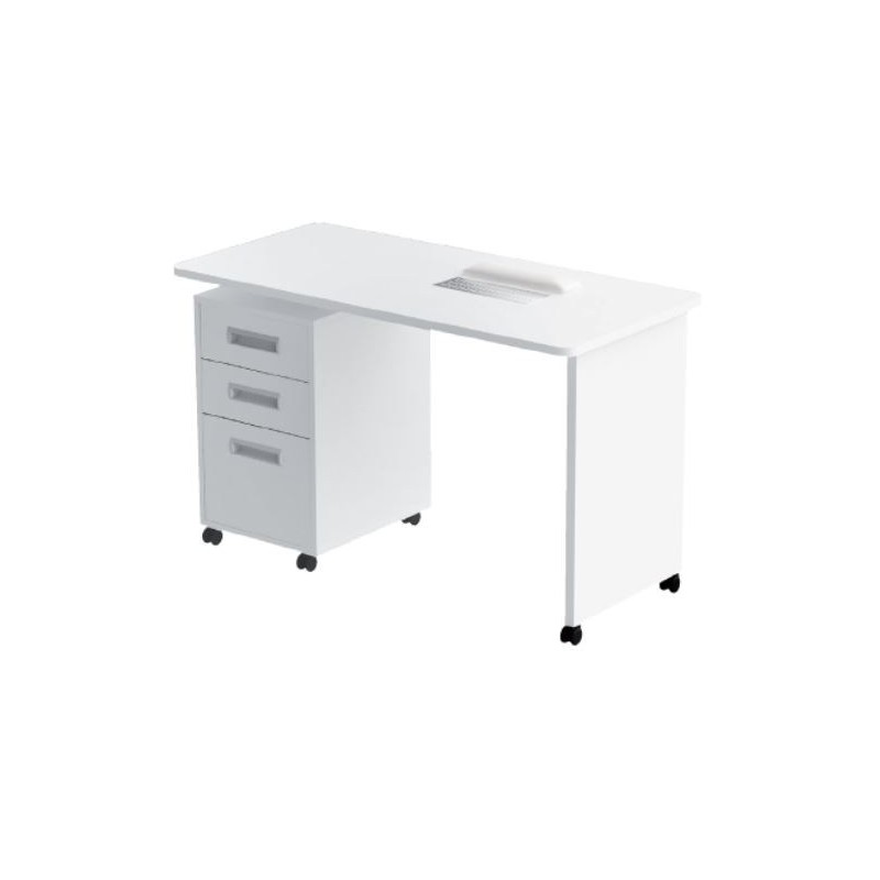 Stolik kosmetyczny do manicure. Wykonany z płyty laminowanej w białym kolorze. Szafka z trzema szufladami. Pochłaniacz dostępny jako opcja dodatkowa za dopłatą.