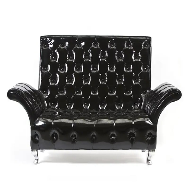Pikowana tapicerka z guzikami powlekanymi lateksem oraz boczki poczekalni są zaokrąglone na zewnątrz.