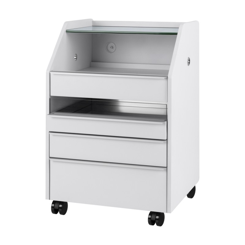 Wąska, górna półka szklana umożliwia wygodne odkładanie najczęściej używanych akcesoriów. Szafka wyposażona jest w cztery szuflady o zróżnicowanych rozmiarach, co sprzyja uporządkowanemu przechowywaniu narzędzi i produktów kosmetycznych. Lustrzane dno jednej z szuflad oraz dedykowany organizer wewnętrzny sprzyjają lepszej organizacji narzędzi, zapewniając szybki dostęp do niezbędnych akcesoriów i podnosząc komfort pracy podczas zabiegów. Wysokość górnej otwartej szuflady pozwala na ustawienie niezbędnych urządzeń, takich jak frezarka z pochłaniaczem.