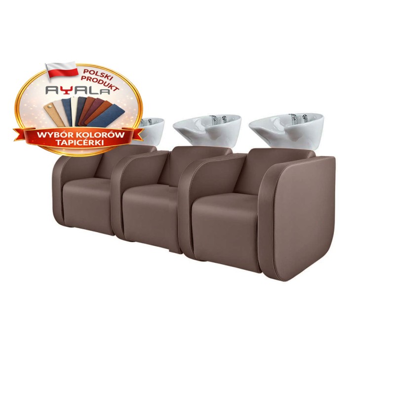 Potrójna Myjnia fryzjerska Ayala Globe z opcjonalnym elektrycznie regulowanym podnóżkiem. Model ten charakteryzujący się obszernym siedziskiem z możliwością rozłożenia podnóżka pod nogi klienta. Myjnia Globe Ayala posiada wysoką kontrukjcę, która ułatwi pracę wyższym fryzjerom. Dostępna również w wersji bez elektrycznego podnóżka w niższej cenie.