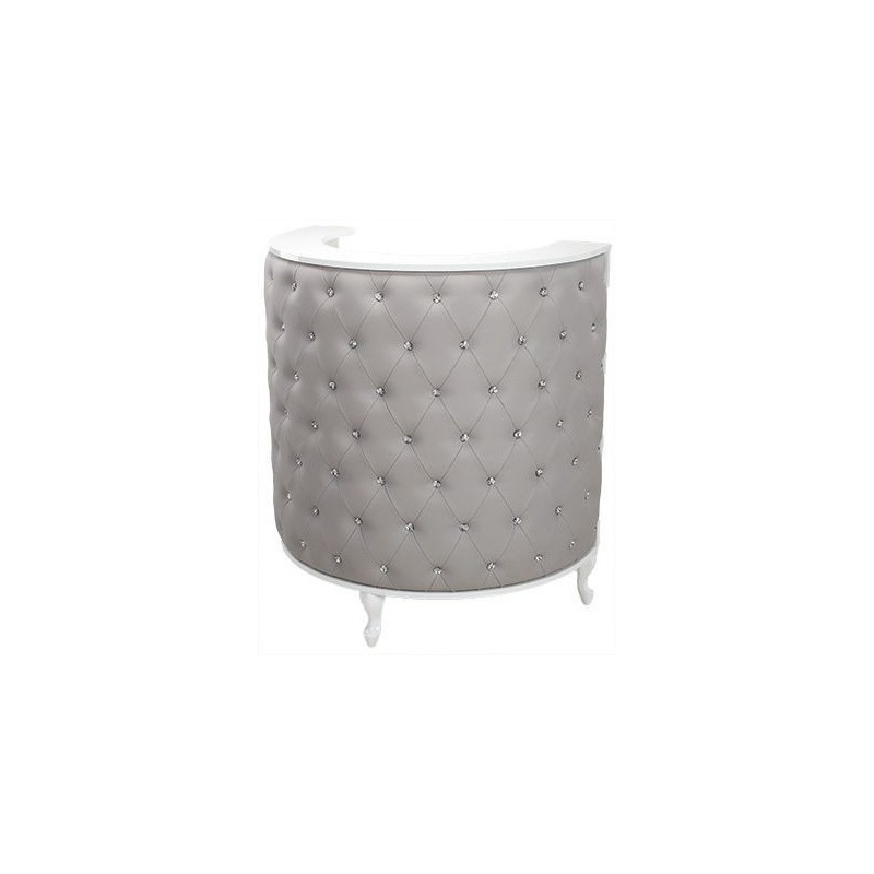 Stylowa półokrągła recepcja tapicerowana, zdobiona kryształami Swarovski Elements. Blat i stelaż recepcji wykonane z płyty meblowej, dostępnej w 16 kolorach i strukturach. Recepcja posiada stylowe wygięte nóżki, wykonane z litego drewna. Od strony roboczej recepcja posiada przydatne półki oraz jedną szufladę. Front recepcji tapicerowany wysokiej jakości skajem, dostępnym w wielu kolorach.